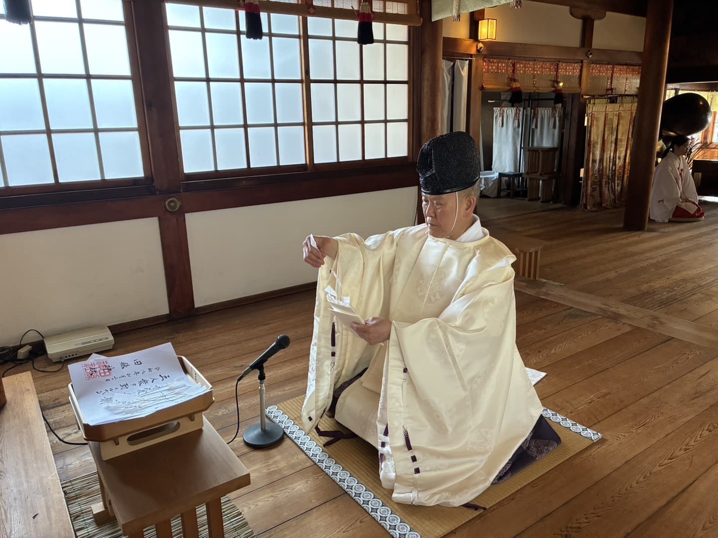 御輿行列が田縣神社に向かう頃、田縣神社拝殿では神職による神事「例大祭」が厳粛に進められ、祭りの終盤には境内へとたどり着いた「女神坐像」「御前御輿」「陽物御輿」がそれぞれ社殿内に納められ、御神威の発揚を参加者全員で祈願いたします。