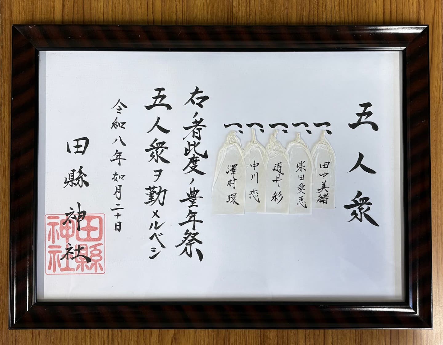 豊年祭(3月15日)の行列に奉仕する女性参加者「五人衆」は、令和8年2月20日にご神前にて執り行われた「籤取式(くじとりしき)」におきまして以下の通り決まりました。